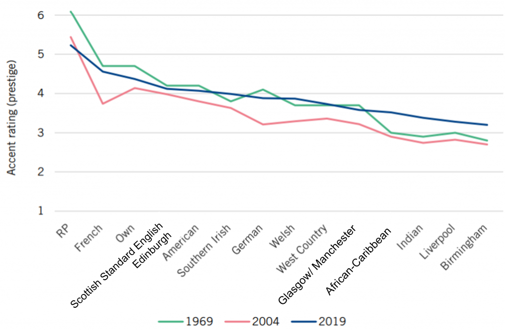 The Accent Bias in Britain project identified a ‘hierarchy of accent prestige’ that has existed for over 50 years. Standardised accents like ‘Scottish Standard English’ and ‘Received Pronunciation’ are valued as more prestigious than accents associated with ethnic minorities (e.g., Indian) and former industrial cities/towns (e.g., Glasgow, Birmingham).